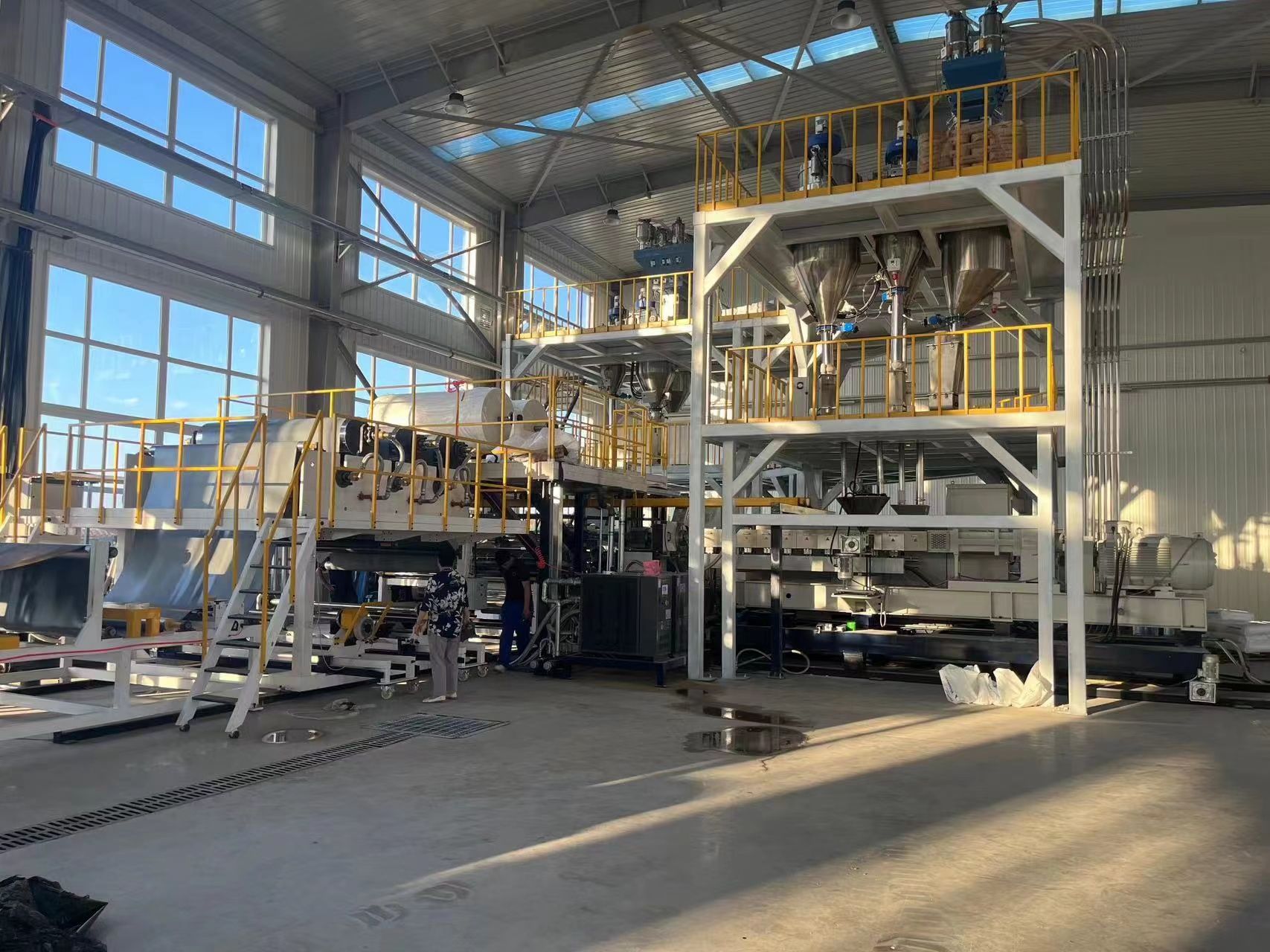 PET/PLA擠出片材生產(chǎn)線是我公司吸收國際先進(jìn)技術(shù),融合多項(xiàng)生產(chǎn)工藝配方體系,鞏固研發(fā)出的一種免結(jié)晶干燥新型擠出片材生產(chǎn)線,采用精密三輥壓延工藝技術(shù),一種雙螺桿擠出機(jī)自動(dòng)跟蹤補(bǔ)料裝置(專利號:2020223016414),減少了原料的粘度,提高了冷卻效率,大大提升片材的品質(zhì)和產(chǎn)量,生產(chǎn)線具有綠色環(huán)保低耗能,工藝簡單,操作便捷,結(jié)構(gòu)緊湊,性能優(yōu)越,塑化均勻、擠出穩(wěn)定、產(chǎn)量.….